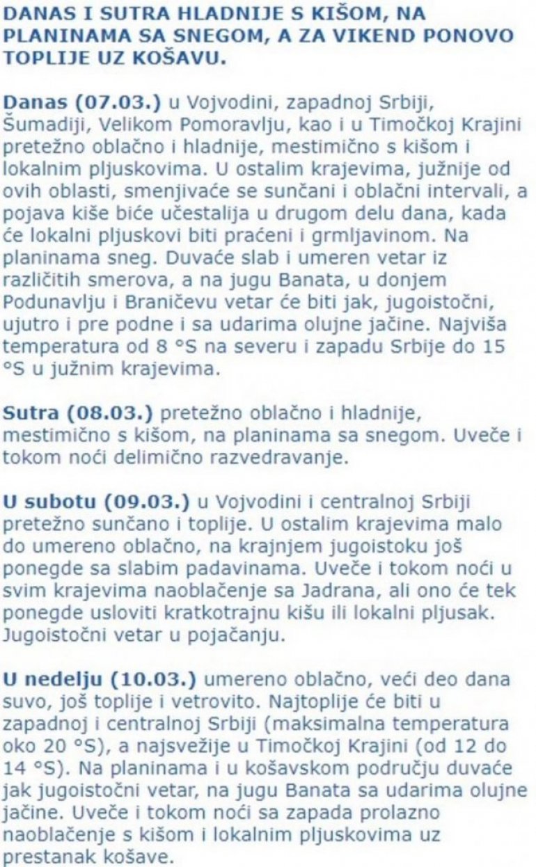 Увече и током ноћи се очекује пролазно наоблачење са запада праћено кишом и локалним пљусковима, уз престанак кошаве. У наредним данима ће бити честа наоблачења с кишом (на планинама са снегом), с сунчаним периодима између њих, што ће обележити први део наредне седмице. Почетком недеље се очекује пораст температуре, док ће касније доћи до постепеног пада температуре.