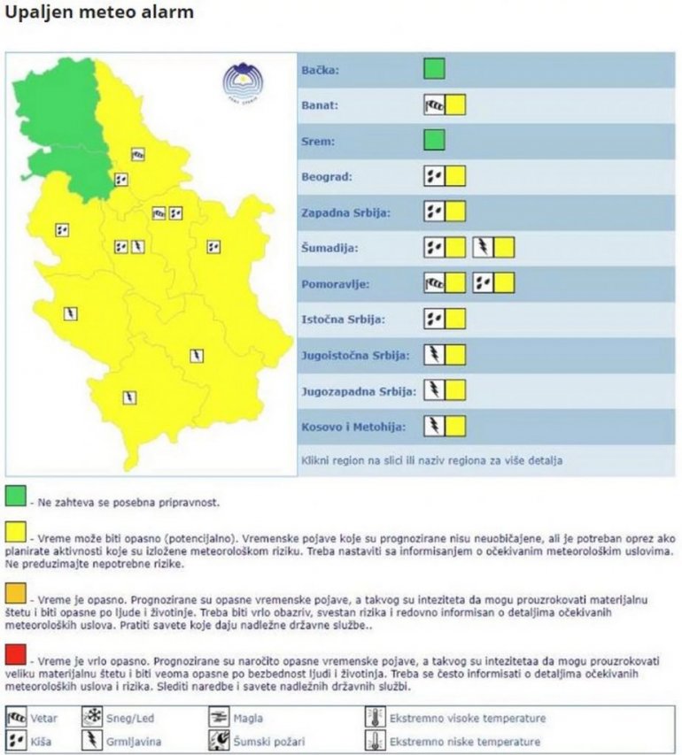 У готово целој Србији, осим у Бачкој и Срему, активиран је жути метеоаларм. На подручју Баната због јаког ветра, у Београду, западној и источној Србији, Шумадији и Поморављу због кише. Такође, метеоаларм је на снази и због грмљавине у Шумадији, југоисточној и југозападној Србији, као и на простору КиМ.