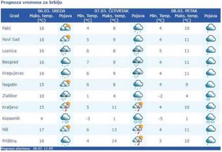 Најнижа температура биће од три до седам степени, док ће највиша температура варирати од осам степени на северу и западу Србије до 15 степени на југу.