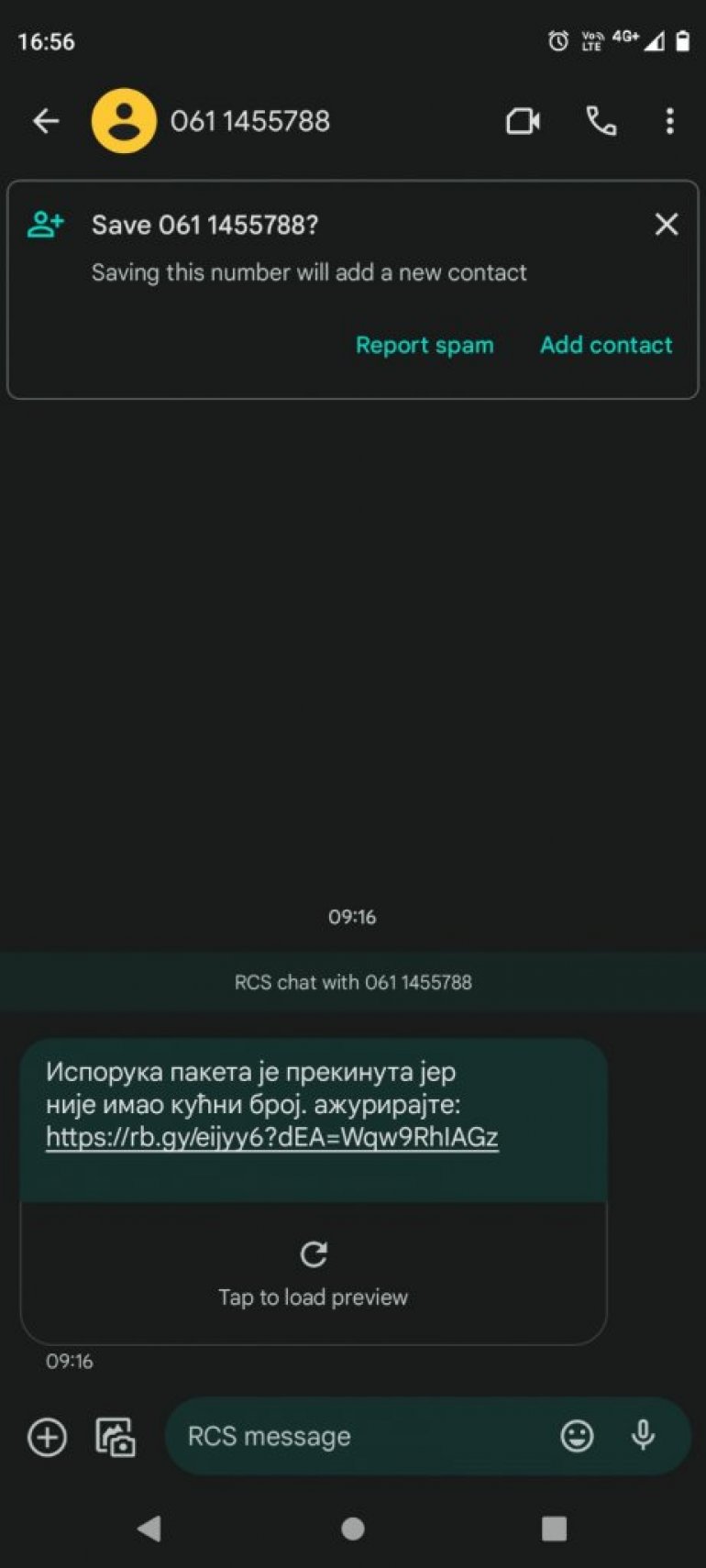 - Пошта Србије: Ваш пакет је стигао у магацин, али се задржава због нејасних адртеса и не може бити испоручен. Молимо потврди адресу на линку у року од 12 сати.... (Молимо вас, кликните на линк изнад како би се актуализирали или копирали УРЛ да би ушли у Гоогле), пише у сумњивој поруци која последњих дана стиже нашим суграђанима.