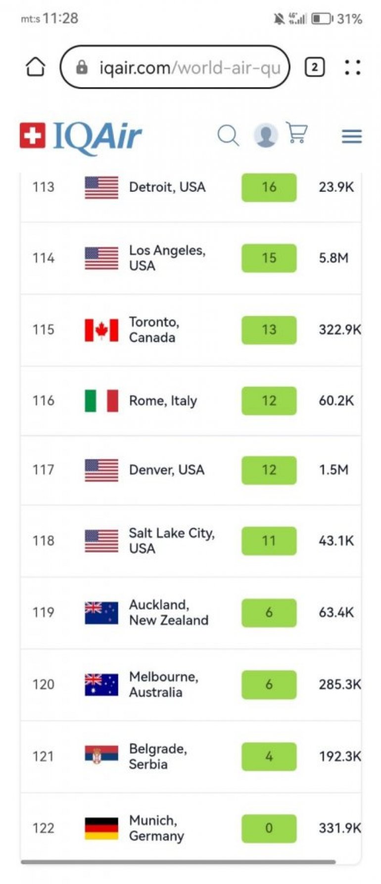 Наиме, Београд је на овој листи добио зелену ознаку - која показује да је ваздух у граду доброг квалитета. Српска престоница тако је тек 121. на листи најзагађенијих градова, oдносно на другом месту на планети са најчистијим ваздухом данас.