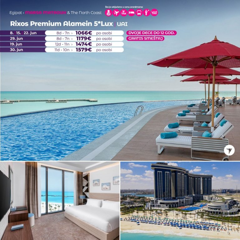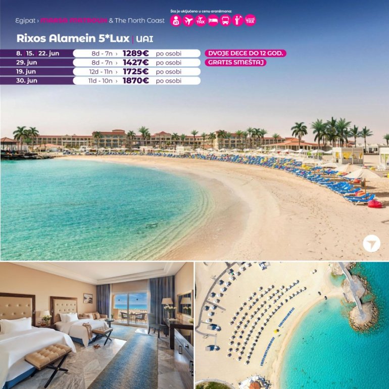 Уз уникатну боју плавог мора и белог песка, које смо навикли да видимо само на егзотичним дестинацијама попут Малдива, дефинитивно Marsa Matrouh за лето 2024 представља најбоље решење а посебно ако имамо у виду шок цену коју нудимо на 7, 10 и 11 ноћења са All inclusive услугом.