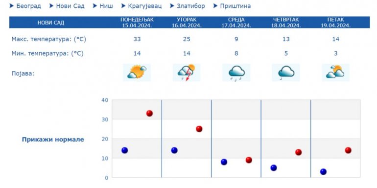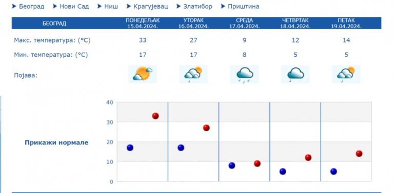 Просечна максимална температура за ово доба године у Србији је од 15 до 20 степени, тако да ће наредних дана температуре бити и за 15 степени више од просека.
