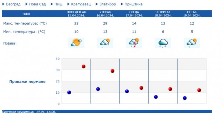 Најврелије ће бити у понедељак, уз максималне температуре и преко 30 степени, а локално се очекује и до 33 степена Целзијуса. Максимална температура у Београду биће до 31 степен Целзијуса.
