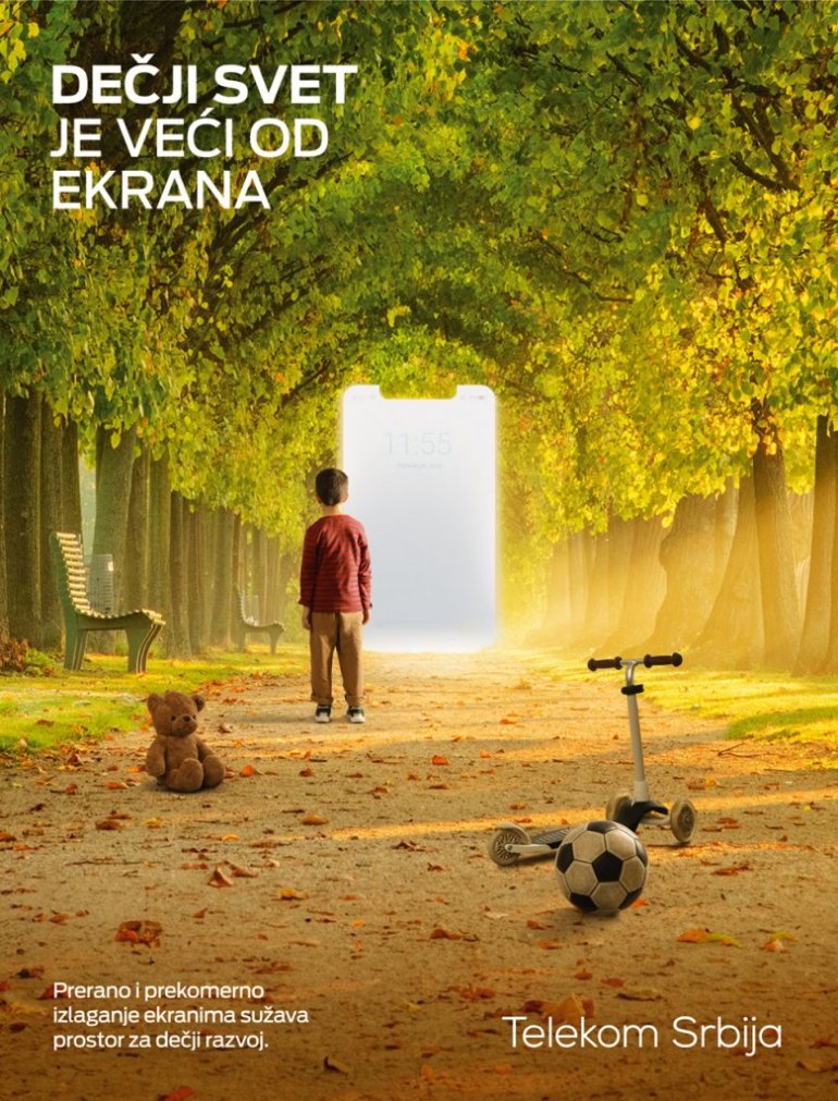 Као регионални лидер у области телекомуникација и одговоран актер у заједницама у којима послује, Телеком Србија покренуо је друштвено одговорну кампању „Дечји свет је већи од екрана“. Циљ кампање је да се обезбеди додатни простор и чује мишљење стручњака на ову тему и тиме пружи подршка родитељима и јавности о важности уравнотеженог коришћења екрана и дигиталних уређаја у раном развоју деце.