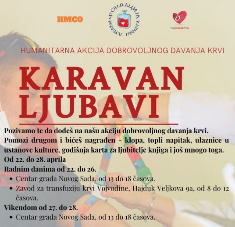 ОРГАНИЗАЦИЈА „На младима Србија остаје”, заједно са Фондацијом „Караван љубави”, уз подршку Института за трансфузију крви Србије, организује кампању добровољног давања крви под називом „Караван љубави” у периоду 22. 4. до 28. 4. у Новом Саду.