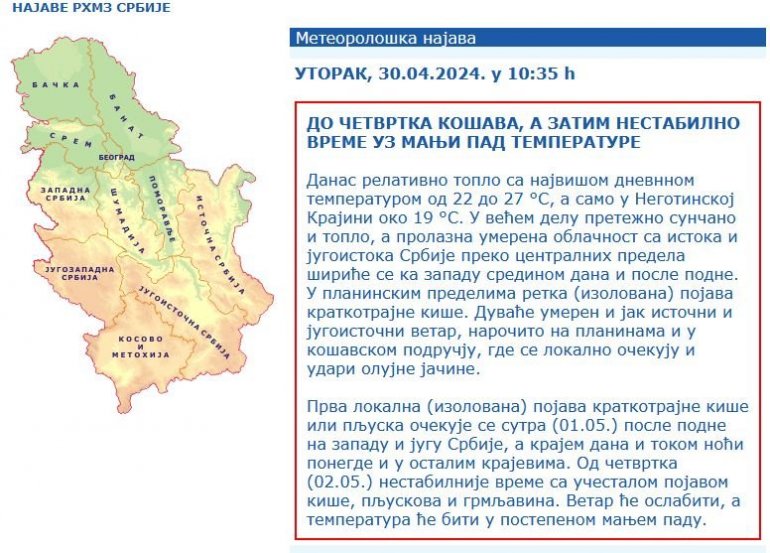 Од четвртка (02. маја) нестабилније време са учесталом појавом кише, пљускова и грмљавина. Ветар ће ослабити, а температура ће бити у постепеном мањем паду.