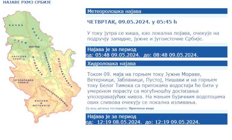 РХМЗ је издао хитно упозорење за подручје централне и јужне Србије где се очекују обилни пљускови са грмљавином, уз количину падавина од 20 до 40 мм.