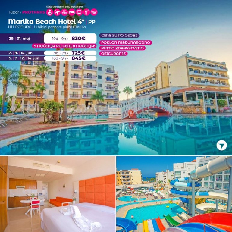 Одличан хотел, лоциран недалеко од центра Протараса, на најлепшем делу дугачке пешчане плаже. Од садржаја хотел има ресторан, бар, спољашњи базен, дечји базен, тениски терен, теретану, анимацију током дана и вечери, музички програм. Све собе су климатизоване, имају ТВ, фен, телефон, а уз доплату могу се користити фрижидер, сеф и вај-фај интернет.