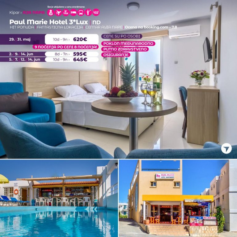 Објекат Paul Marie Hotel Apartments је смештен у центру летовалишта Аја Напа и располаже рестораном и кровним базеном на отвореном. Вај-фај је доступан у заједничким просторијама. Студији и апартмани у објекту Paul Marie Hotel садрже простор за седење и балкон са погледом на врт.