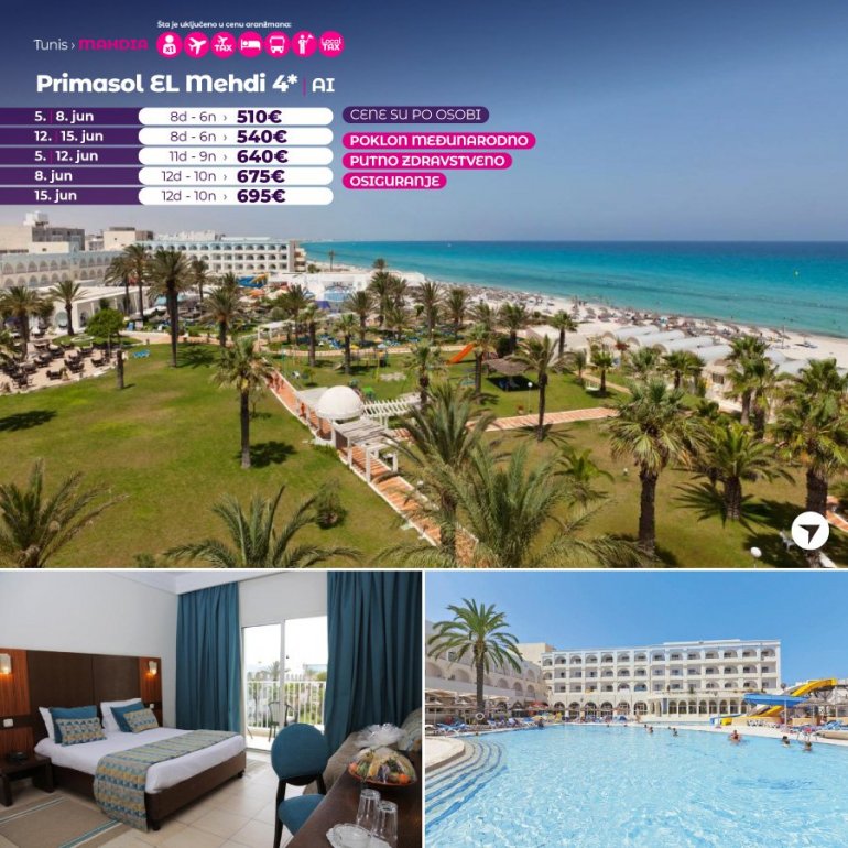 All-inclusive хотел Primasol El Mehdi се налази на 2 км од центра Махдије и на 50 метара од приватне плаже, са директним прилазом из хотела. Хотел је на одличној локацији, у близини старог дела града.