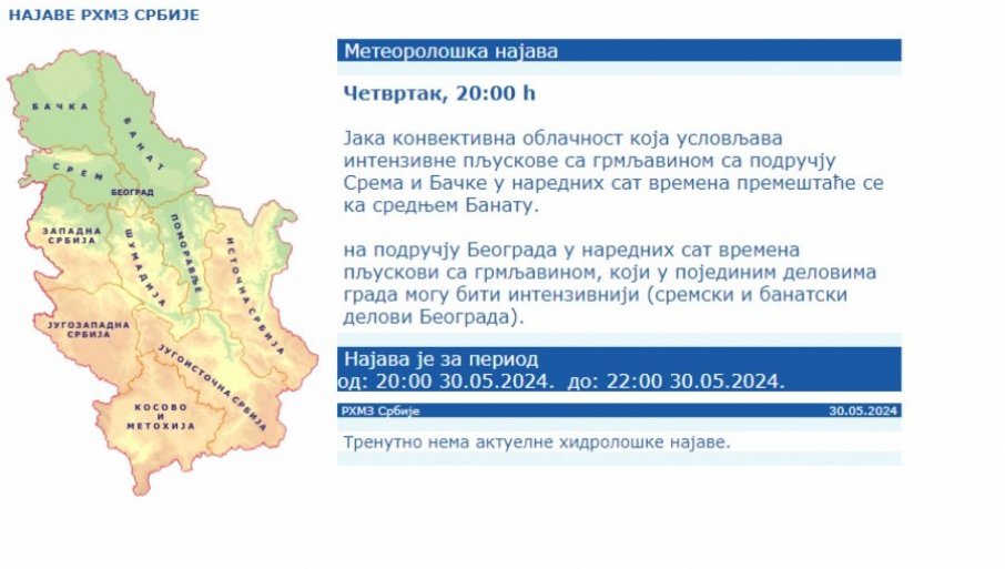 РЕПУБЛИЧКИ хидрометеоролошки завод Србије издао је данас нову метеоролошку најаву.