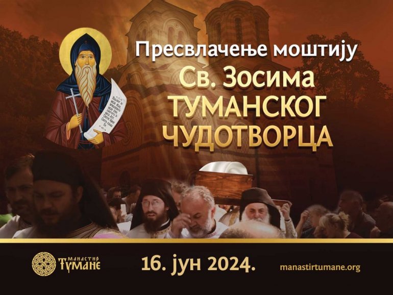 - Позивамо верни народ са радошћу и љубављу на свету литургију и пресвлачење моштију Светог Зосима, туманског чудотворца, у недељу, 16. јуна 2024. године. Овај духовни сабор је жива, текућа река народа Божјег, где се око моштију туманског чудотворца са љубављу сабере преко 30.000 душа и који показује да је наш народ веран Господу, веран својим светим прецима и да истински и правим путем корача у светлију и благословену будућност - рекао је архимандрит Димитрије.