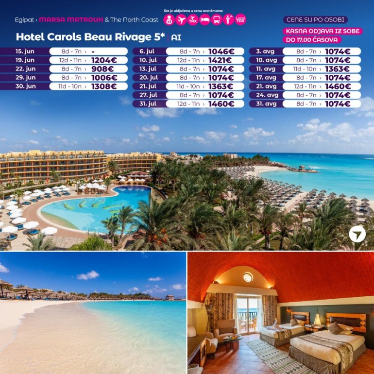 Добродошли у Marsa Matrouh - оазу на египатском Медитерану - која је веома популарна међу туристима из Италије, Чешке, Словачке, Немачке… Задовољство нам је да смо коначно, у сарадњи са Аир Сербиом, успели да организујемо два директна лета до ове најлепше плаже на читавом Медитерану.