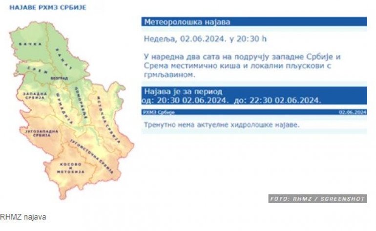 - У наредна два сата на подручју западне Србије и Срема местимично киша и локални пљускови с грмљавином - наводи се у РХМЗ најави.