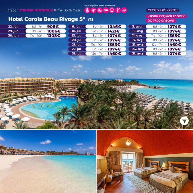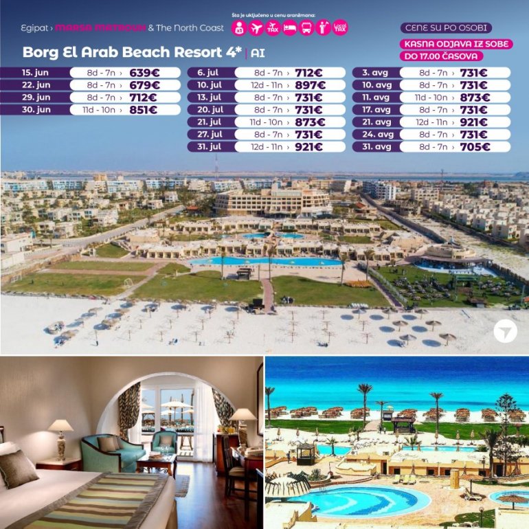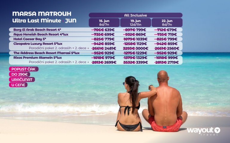 Добродошли у Marsa Matrouh - оазу на египатском Медитерану - која је веома популарна међу туристима из Италије, Чешке, Словачке, Немачке… Задовољство нам је да смо коначно, у сарадњи са Air Serbiom, успели да организујемо два директна лета до ове најлепше плаже на читавом Медитерану.