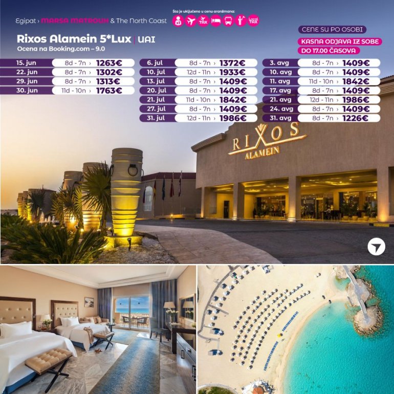 Rixos Premium Alamein смештен је на обали Медитерана, са погледом на кристално чисто море. Овај небодер направљен је за све оне који желе да се препусте сјају El-Alameina. Rixos Premium Alamein је основа за раскошна путовања током целе године.