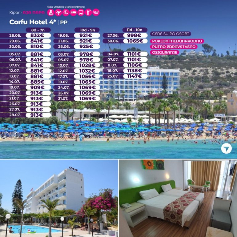 Хотел Corfu је смештен на само 5 минута хода од динамичног центра Аје Напе, где се налазе продавнице и ресторани. Објекат нуди поглед на Грчку плажу и рибарску луку. Хотел поседује отворени базен, као и засебан дечији базен и игралиште за најмлађе госте.