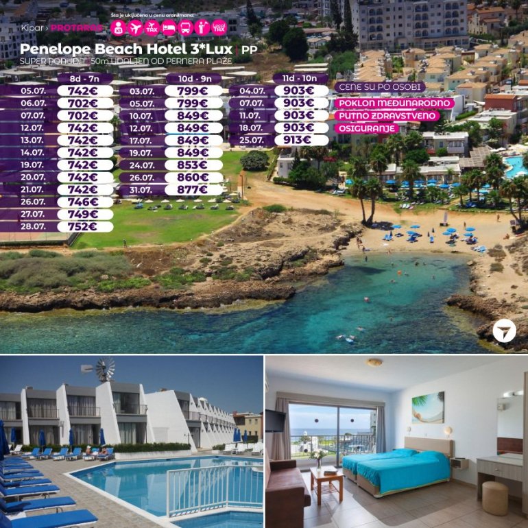 Penelope Beach хотел налази се у Протарасу. Најближа плажа Пернера удаљена је свега 5 минута шетње а можете посетити и околне плаже као што је Каламиес плажа која је удаљена 10 до 15 минута шетње. На 100м од објекта налазе се ресторани и маркети. Од главне улице и главних дешавања у Протарасу дели вас само неколико минута вожње.