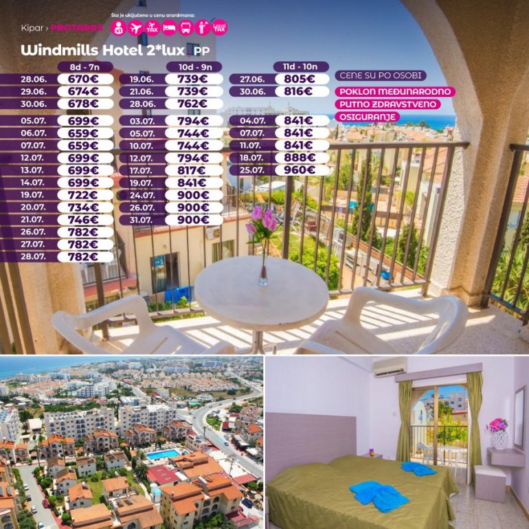 Hotel Windmills налази се у популарном летовалишту Пернера, на 5 минута хода од пешчаних плажа означених Плавом заставицом. У понуди има 2 базена и избор барова и ресторана.