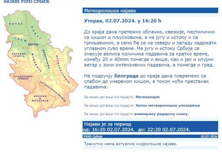 РЕПУБЛИЧКИ хидрометеоролошки завод огласио се на свом званичном сајту са најновијим упозорењем на временске непогоде.