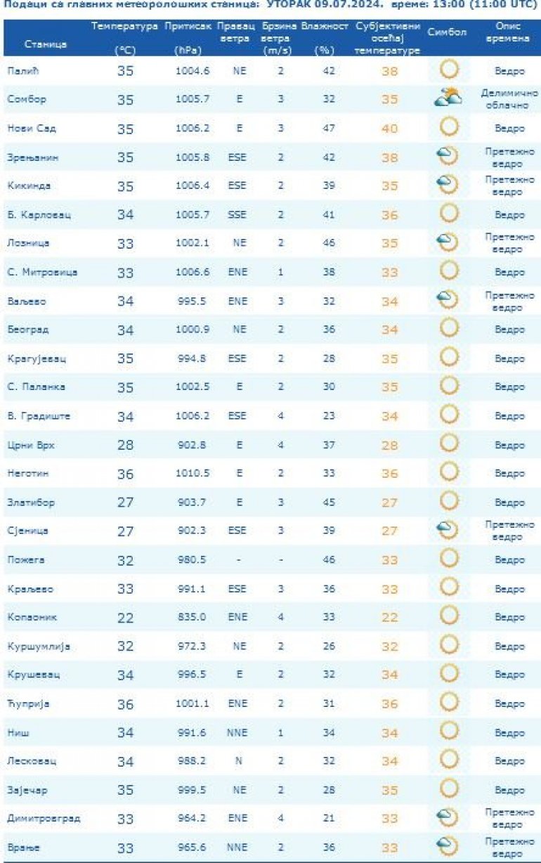 Најтоплији градови тренутно су Неготин и Ћуприја. Према подацима Републичког хидрометеоролошког завода (РХМЗ), у њима је у 13 часова измерено чак 36 степени. За њима следе Палић, Сомбор, Нови Сад, Зрењанин, Кикинда, Крагујевац, Зајечар и Смедеревска Паланка, где се жива у термометру попела на 35 поделак.