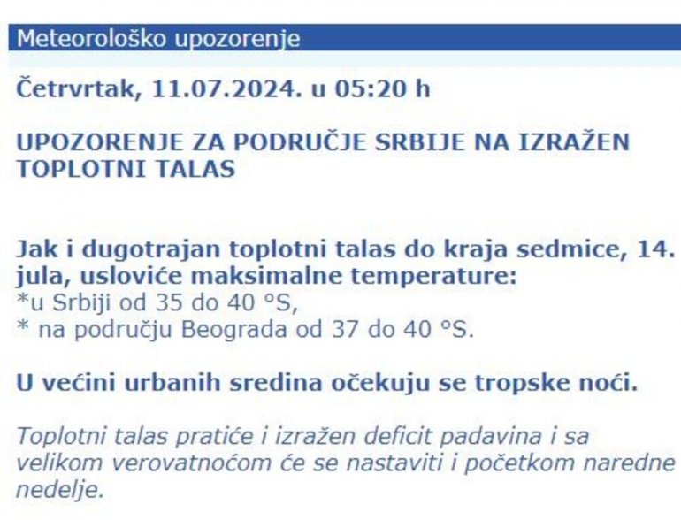 У већини урбаних средина очекују се тропске ноћи. Топлотни талас пратиће и изражен дефицит падавина и са великом вероватноћом ће се наставити и почетком наредне недеље.