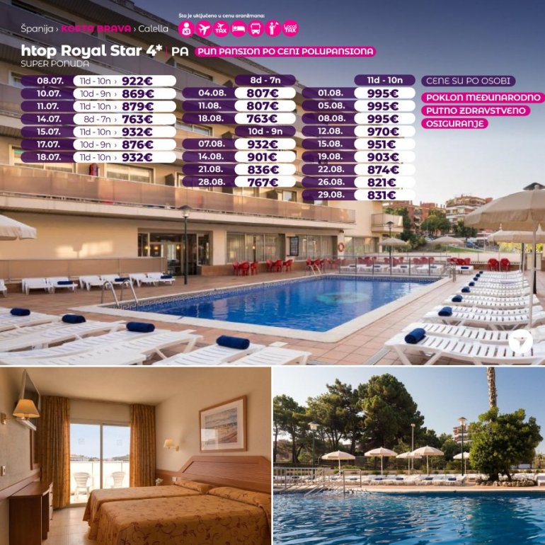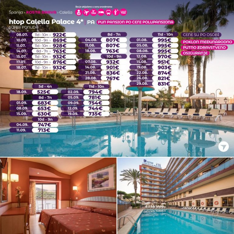Hotel hTop Calella Palace налази се у регији Коста Брава у месту Калеља. Смештен је у близини једне од лепших пешчаних плажа и старог града. Плажа је удаљена 700 м од хотела. Дуж целе обале простире се пруга која води до Барселоне. Хотел такође нуди отворени базен, теретану, базен за децу, СПА центар, кидс клуб, мини водени парк за децу као и џакузи који се налази на последњем спрату хотела на великој тераси која нуди велики број лежаљки за сунчање.
