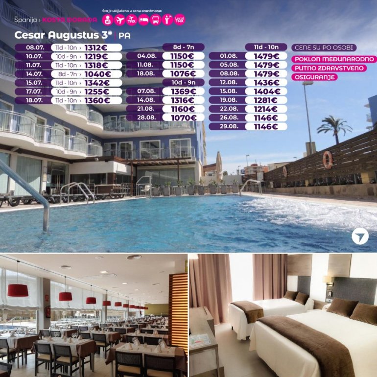 Хотел Cesar Augustus налази се на 80 метара од плаже, а у своју приступачну цену укључује и базен на отвореном за децу и одрасле. Током летње сезоне доступни су и анимацијски програми и забава за децу и породице. Центар Salou-а удаљен је на свега 15 минута шетње од хотела.