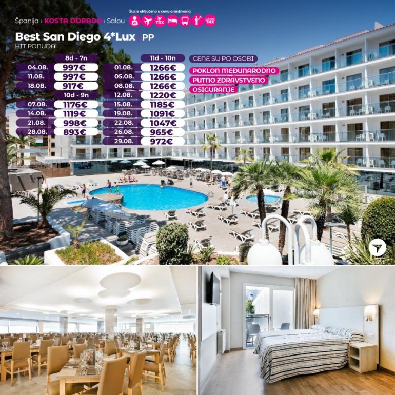 Хотел Best San Diego налази се на идеалној локацији, на само 200 метара од плаже Леванте у граду Салоу. Објекат нуди базен на отвореном, хидромасажну каду и собе са балконима. Плажа Капеланс, са читавим низом садржаја за спортове на води, удаљена је само 5 минута хода од хотела. Центар града Салоу налази се на мање од 800 метара од смештајног објекта.