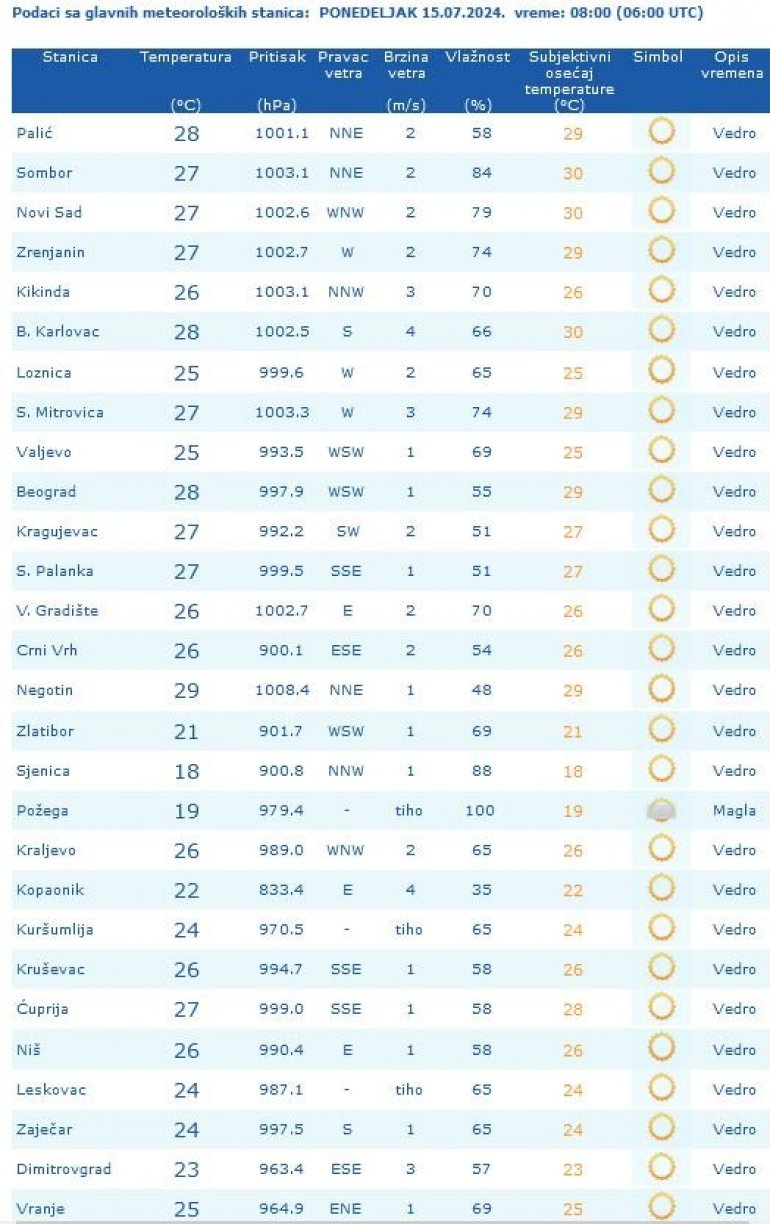 Према подацима РХМЗ-а, највиша температура у 8 сати измерена је у Неготину, 29 степени. Затим следе, са 28 степени, Београд, Палић и Банатски Карловац.