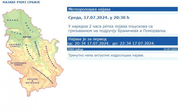 - У наредна 2 часа ретка појава пљускова са грмљавином на подручју Браничева и Поморавља - стоји у објави на сајту РХМЗ.