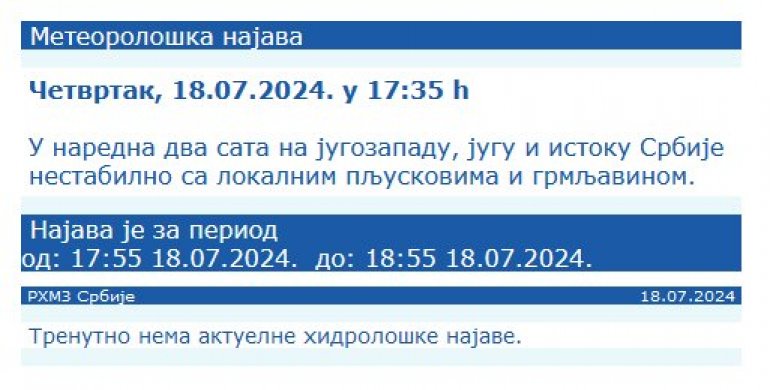 - У наредна два сата на југозападу, југу и истоку Србије нестабилно са локалним пљусковима и грмљавином - стоји на сајту РХМЗ.