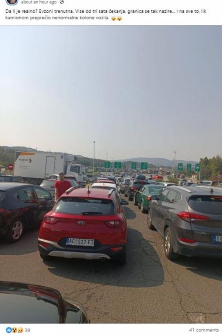 НА ПОПУЛАРНОЈ Фејсбук групи која окупља српске туристе и љубитеље грчког приморја, објављена је најновија фотографија са граничног прелаза Евзони на ком се после македонске Ђевђелије чека за улазак у Грчку.