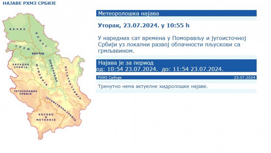 РЕПУБЛИЧКИ хидрометеоролошки завод објавио је на свом сајту да ће у наредних сат времена у Поморављу и југоисточној Србији уз локални развој облачности пљускови са грмљавином.