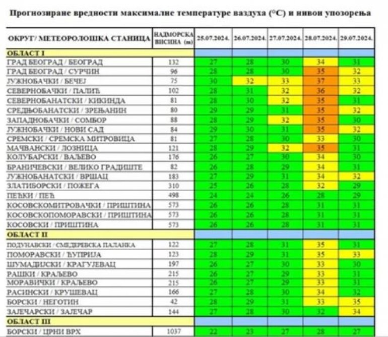 Прогнозиране вредности максималне дневне температуре ваздуха биће у категорији опасне појаве 28. јула на подручју: