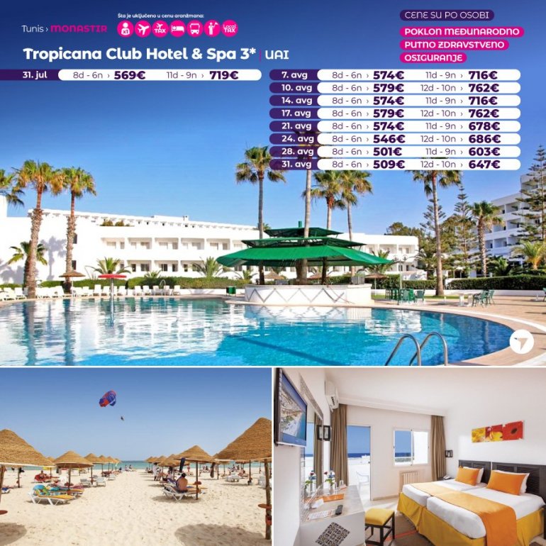 Hotel Tropicana club and SPA je porodičan hotel idealno lociran. Nalazi se na plaži, 3km od aerodroma u Monastiru i 10km od Susa.WiFi je dostupan samo na recepciji.Spa sa tradicionalnim hamamom je takođe na raspolaganju gostima, uz doplatu.