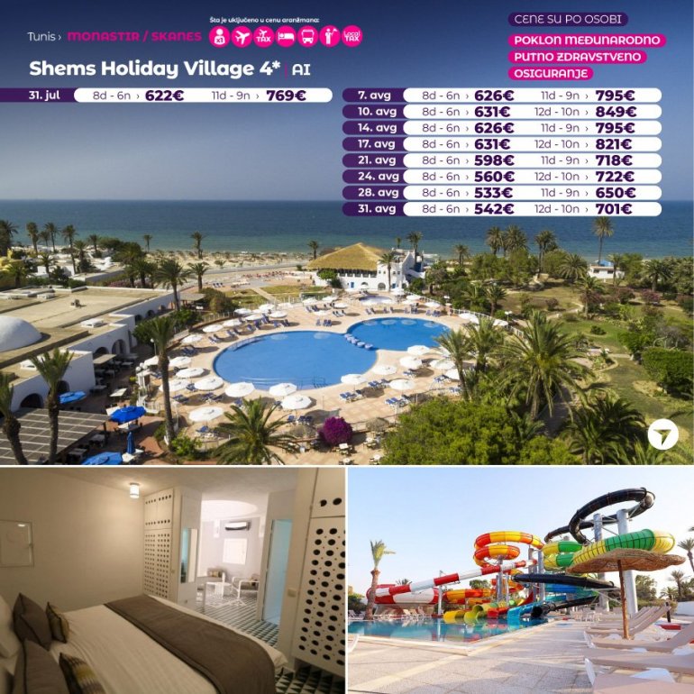 Hotel Shems Holidai Village & Akuapark se nalazi u Monastiru i nudi otvoreni i zatvoreni bazen. Objekat ima besplatan WiFi u javnim prostorima, privatnu plažu i bungalove za samostalan boravak sa klima-uređajem.