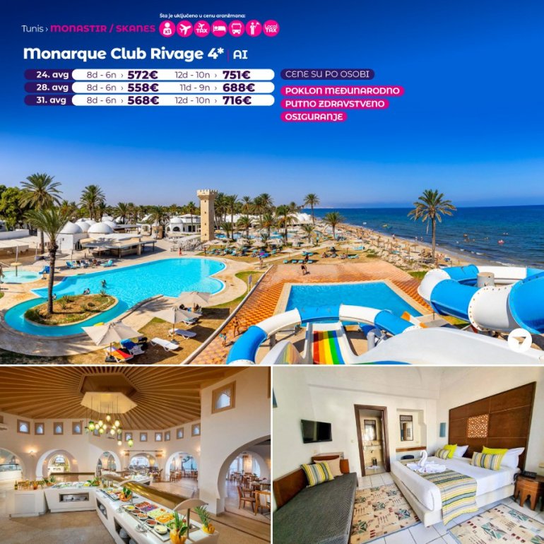 Monarque Club Rivage hotel nalazi se 4km od aerodroma u Monastiru i 12km od Susa. Hotel ima privatnu plažu, gde gosti mogu besplatno koristiti ležaljke i suncobrane, dok su peškiri dostupni uz depozit