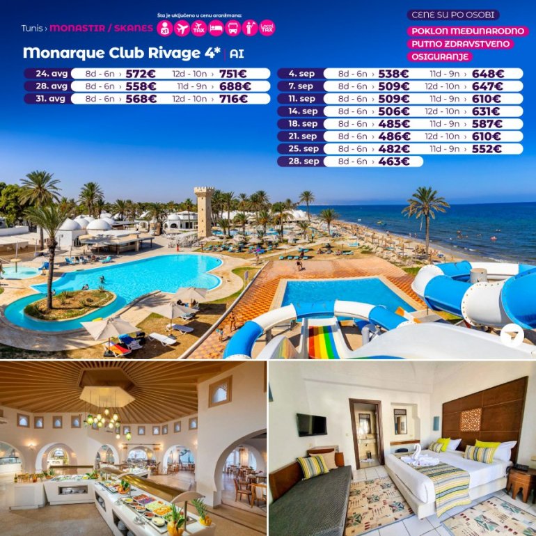 Monarque Club Rivage хотел налази се 4 км од аеродрома у Монастиру и 12 км од Суса. Хотел има приватну плажу, где гости могу бесплатно користити лежаљке и сунцобране, док су пешкири доступни уз депозит.