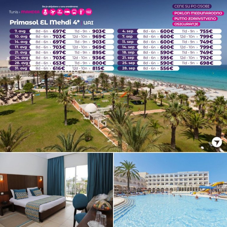All-inclusive хотел Primasol El Mehdi се налази на 2 км од центра Махдије и на 50 метара од приватне плаже, са директним прилазом из хотела. Хотел је на одличној локацији, у близини старог дела града.