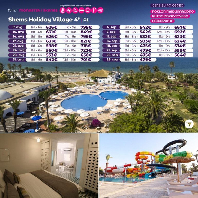 Хотел Shems Holidai Village & Akuapark се налази у Монастиру и нуди отворени и затворени базен. Објекат има бесплатан вај-фај у јавним просторима, приватну плажу и бунгалове за самосталан боравак са клима-уређајем.