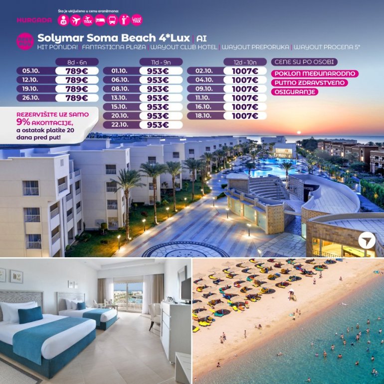 Хотел Солyмар Сома Беацх се налази на прелепом заливу Сома, јужно од Хургаде. Од аеродрома до хотела може да се стигне за 45 минута