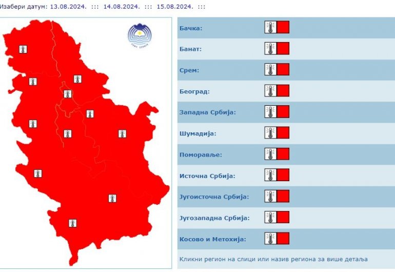 НА подручју целе Србије данас је због високих температура на снази црвени метеоаларм, који означава да је време врло опасно.