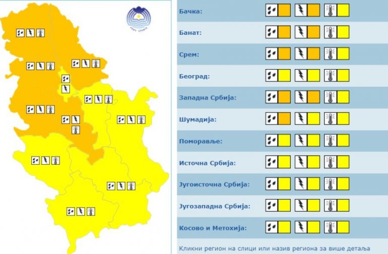 Како се може видети на мапи цела Србија је означена нијансама жуте боје, што означава потенцијално опасно време.