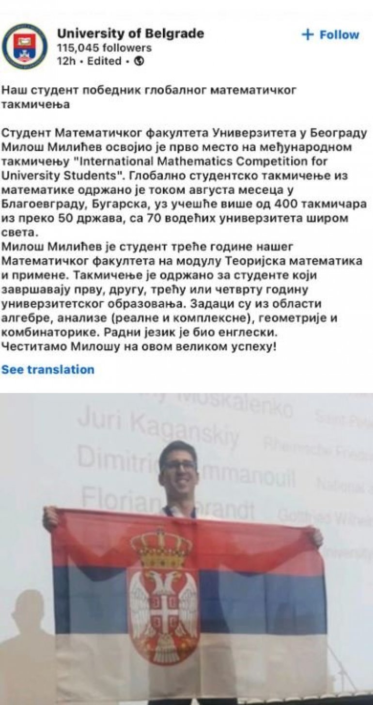 СТУДЕНТ Математичког факултета Универзитета у Београду Милош Милићев освојио је прво место на међународном такмичењу "International Mathematics Competition for University Students".