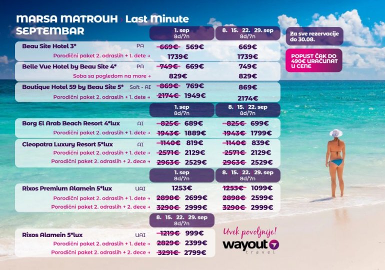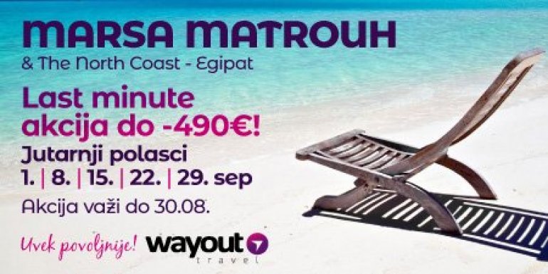 Добро дошли у Marsa Matrouh - оазу на египатском Медитерану - која је веома популарна међу туристима из Италије, Чешке, Словачке, Немачке… Задовољство нам је да смо коначно, у сарадњи са Ер Србијом, успели да организујемо два директна лета до ове најлепше плаже на читавом Медитерану.