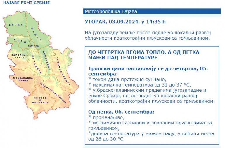 *дневна температура у мањем паду, у већини места од 26 до 30 °C - стоји на сајту РХМЗ-а.
