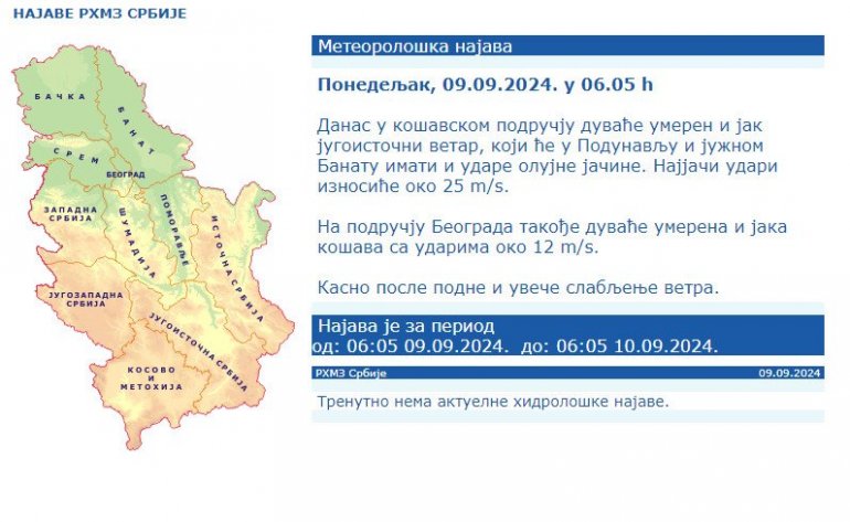РЕПУБЛИЧКИ хидрометеоролошки завод огласио се на свом званичном сајту најновијим упозорењем.