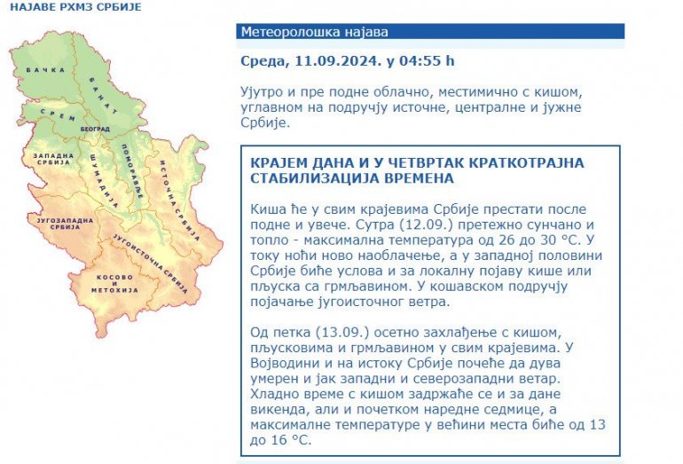 Киша ће у свим крајевима Србије престати после подне и увече. Сутра (12. септембра) претежно сунчано и топло - максимална температура од 26 до 30 °C. У току ноћи ново наоблачење, а у западној половини Србије биће услова и за локалну појаву кише или пљуска са грмљавином. У кошавском подручју појачање југоисточног ветра.